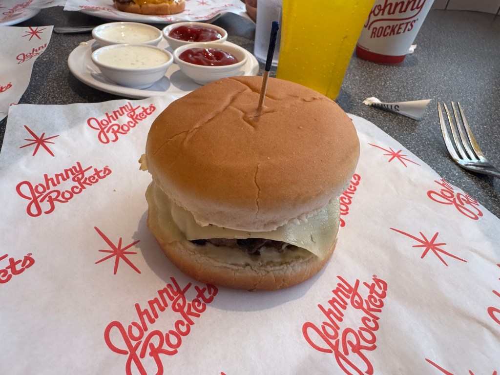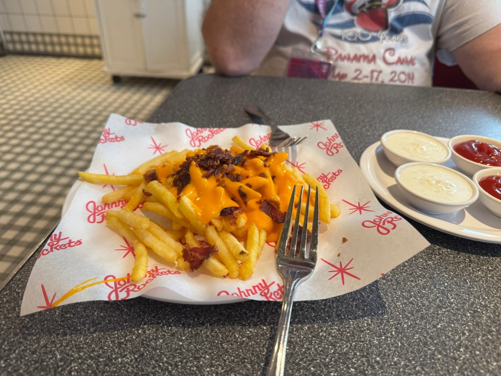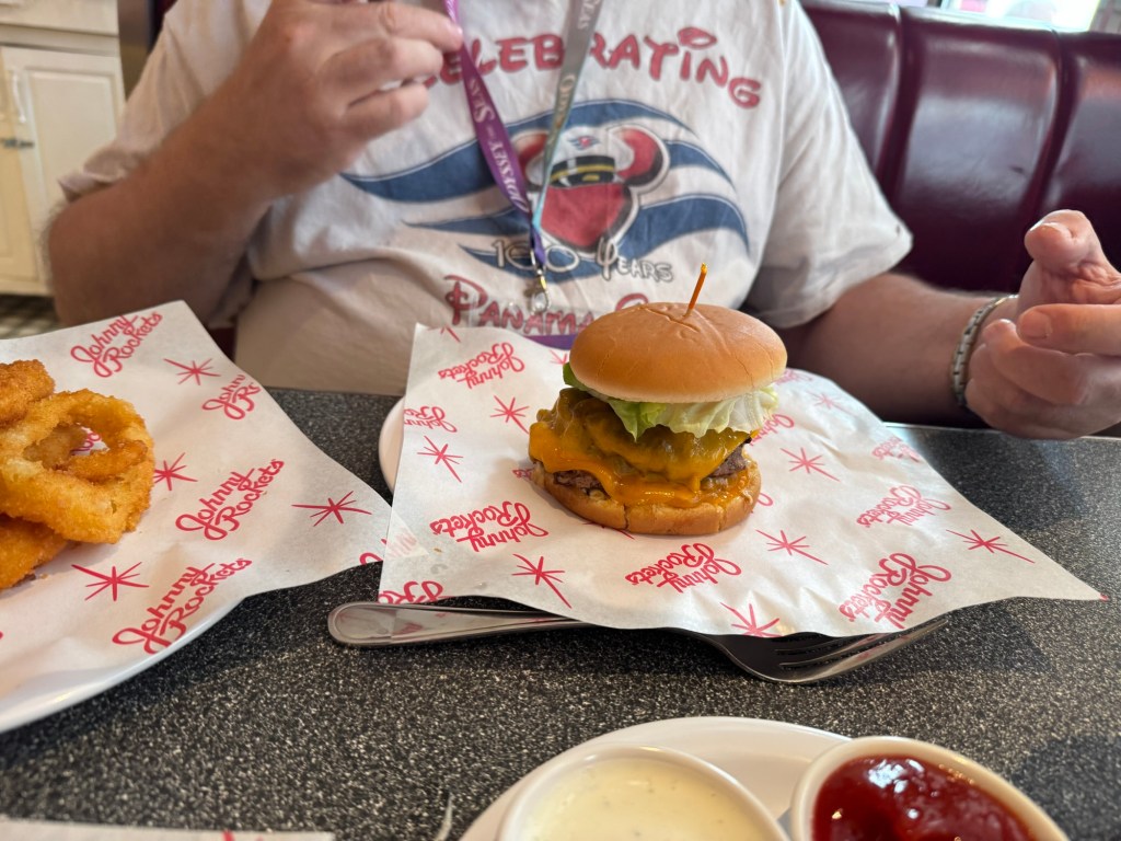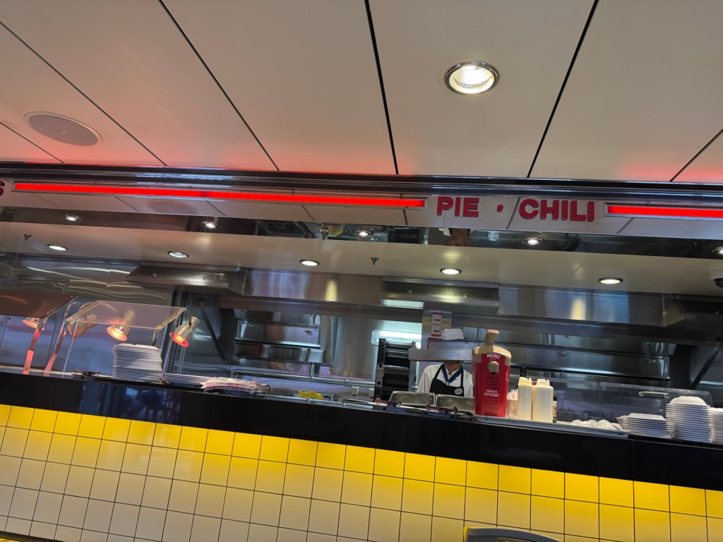 After the trivia, we went to the Boardwalk. They have one included food outlet in this area, which is the Boardwalk Doghouse that offers a range of different hot dogs with sides like pickles, coleslaw, and potato salad. There are also two casual eating places that come with an upcharge. One is Johnny Rockets which is a diner specialising in burgers and the other is Playmakers, which is a sports bar, which offers American bar food. Playmakers is a la carte and Johnny Rockets has a cover charge. As we had the unlimited specialty dining package, we had $25 food credit per person per day to use at those casual dining options. Playmakers was closed until late afternoon, but Johnny Rockets was open. I had an orange soda, which was included with the cover charge. Graham had a strawberry shake. This is normally extra but is covered with drinks packages or through the complimentary drinks vouchers that Royal Caribbean offers for Diamond Crown and Anchor members and above. I ordered the chilli bowl from the starter menu. I have had this before at Johnny Rockets on other ships and it was always very nice. Rather than coming out first as you would expect with a starter, it came out once I had finished my main course. It was also not very nice on this ship. It tasted like taco meat that had come out of a tin. The rest of the food was nice though. Graham had the Rocket Double, which is their signature burger which consisted of two beef patties, cheddar cheese, lettuce, tomato and sliced onion with their special sauce. He had a side of onion rings with this. I was torn between two burgers, but ultimately went with the Route 66, which consisted of a beef patty, Swiss cheese, grilled mushrooms, caramelized onions, and mayonnaise. I had a side of bacon cheese fries with this. It was nothing fancy, but it hit the spot.