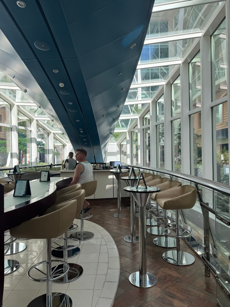 One thing that we never managed to do on Symphony of the Seas was to have a drink at the Rising Tide Bar. The Rising Tide Bar is a unique, moving bar on Royal Caribbean’s Oasis Class ships that travels between the Royal Promenade on deck 5 and Central Park on deck 8. It is essentially a large oval glass lift. I had checked earlier in the day when the first departure from the Royal Promenade was. It said that this was at 14:30. We got down to the entrance of the Rising Tide Bar just ahead of this, but the bar was not there. I checked the app and there it stated that it was not due to open until 15:00. We headed up to Central Park and relaxed somewhere from where we could see the Rising Tide Bar. Just before 15:00, the bartenders arrived. As soon as doors opened, we got on. They have a unique cocktail on the menu that I wanted to try. It is called White Orchid and consists of vodka, coconut water, lemon juice, lychee purée and prosecco. Vodka is not normally my thing, but I liked the rest of the ingredients. It was actually very nice. Graham had another glass of Sauvignon Blanc.