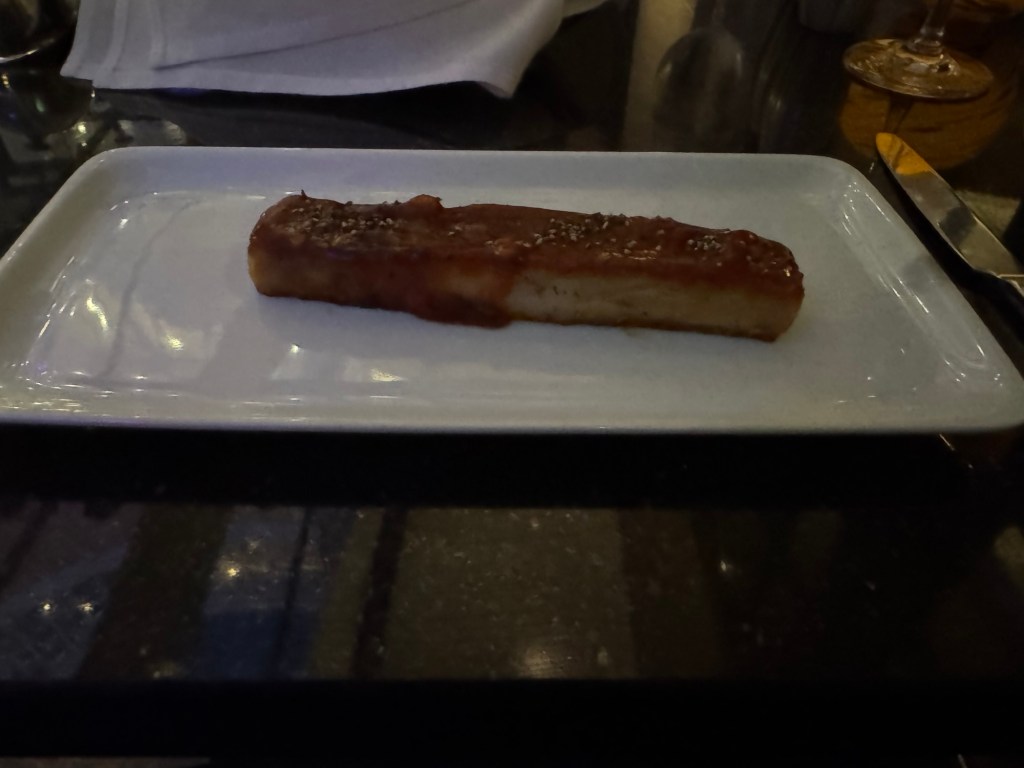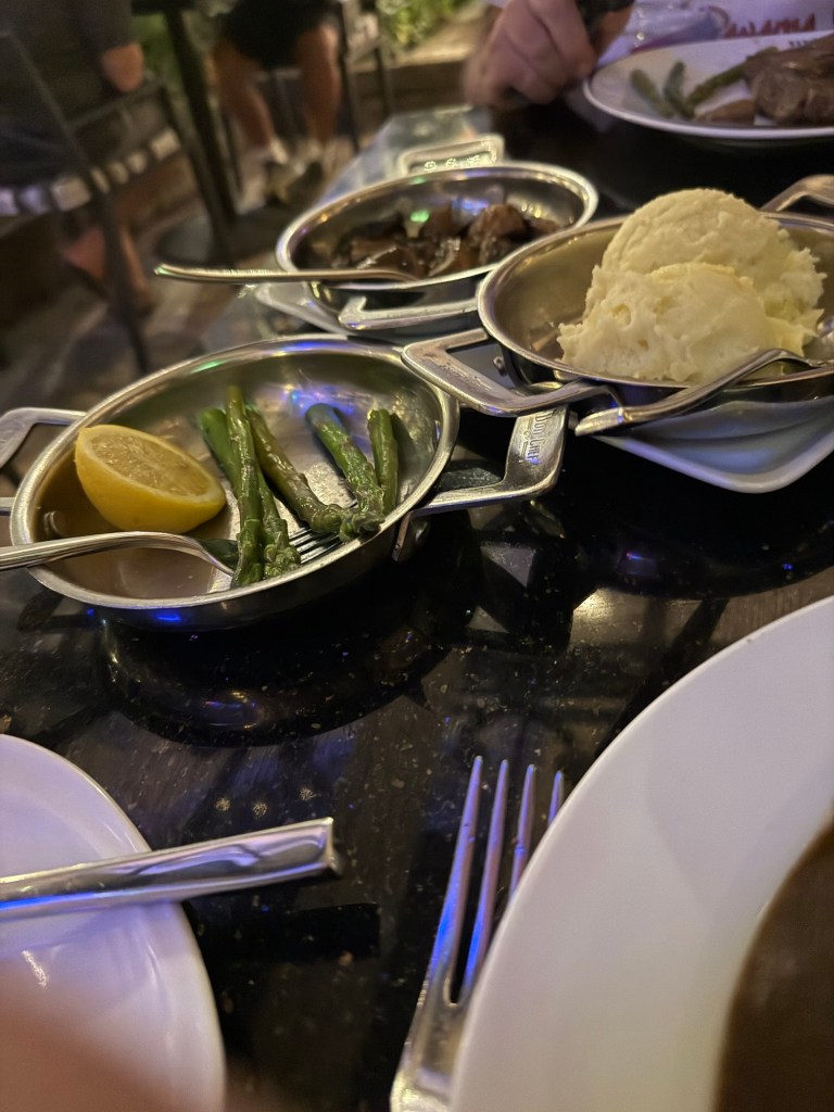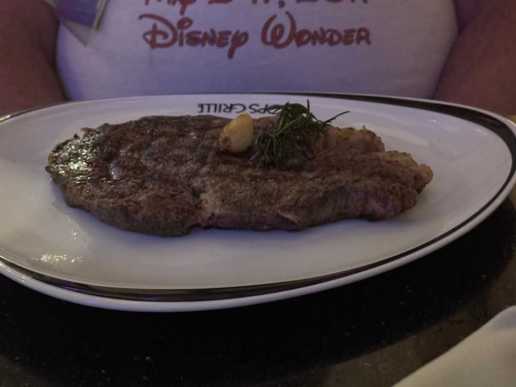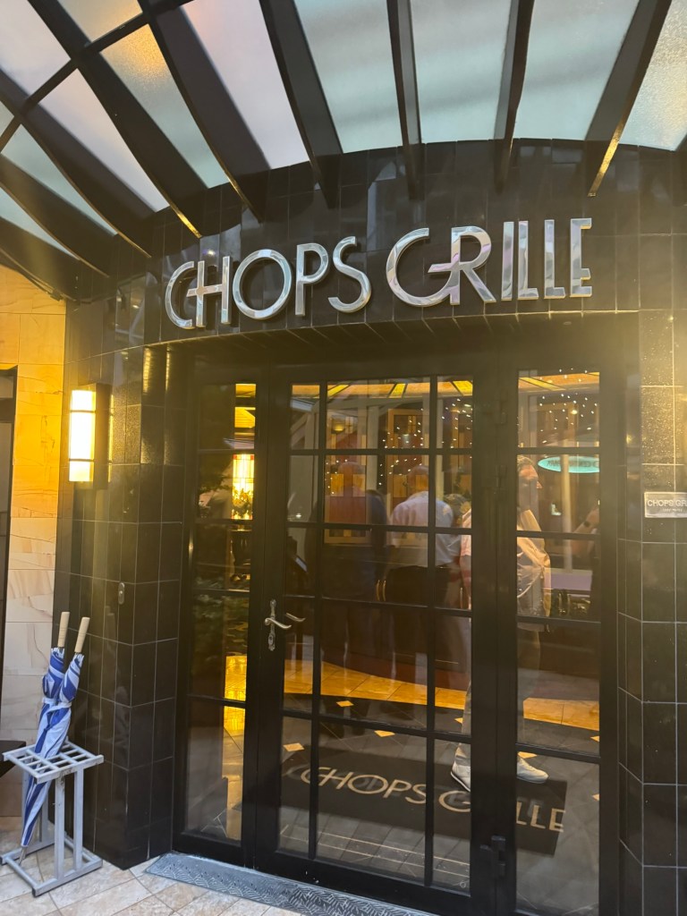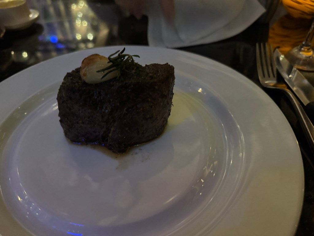 Once the show was over, we headed up to Central Park for dinner. We got some photos near the entrance to Central Park. Then we went to check in at Chops Grille. Chops Grille is Royal Caribbean’s steakhouse concept, and it is to specialty restaurants what Schooner Bars is to bars in that it can be found on every single ship. Our experience with Chops Grille over the years has been variable to say the least. We had everything from absolutely awful to absolutely brilliant and pretty much everything in the middle. We checked in and were offered seating in the conservatory overlooking Central Park. I figured that this may be quite romantic. Our server brought the menu and offered drinks. We both ordered a glass of Moscato. Our server then brought out bread while taking our order. Graham started with the colossal shrimp cocktail with horseradish cocktail sauce, remoulade, and lemon. Normally this is a fairly standard shrimp cocktail, but on this occasion, it was a deconstructed presentation. I had the grilled black pepper bacon. This consists of slow-cooked Berkshire pork with a sweet and spicy glaze. This was delicious. For his main course, Graham ordered the USDA Prime 16 oz bone-in ribeye. This started out promising, but according to Graham, there was a lot of gristle in the middle of the steak. I had the 9 oz filet, which was very nice. The sides at Chops Grille are designed for sharing. We had the grilled jumbo asparagus with sea salt, and lemon; sautéed mushrooms demi-glace, and thyme, and Yukon gold mashed potatoes with salt, and sweet cream butter. We both passed on dessert.