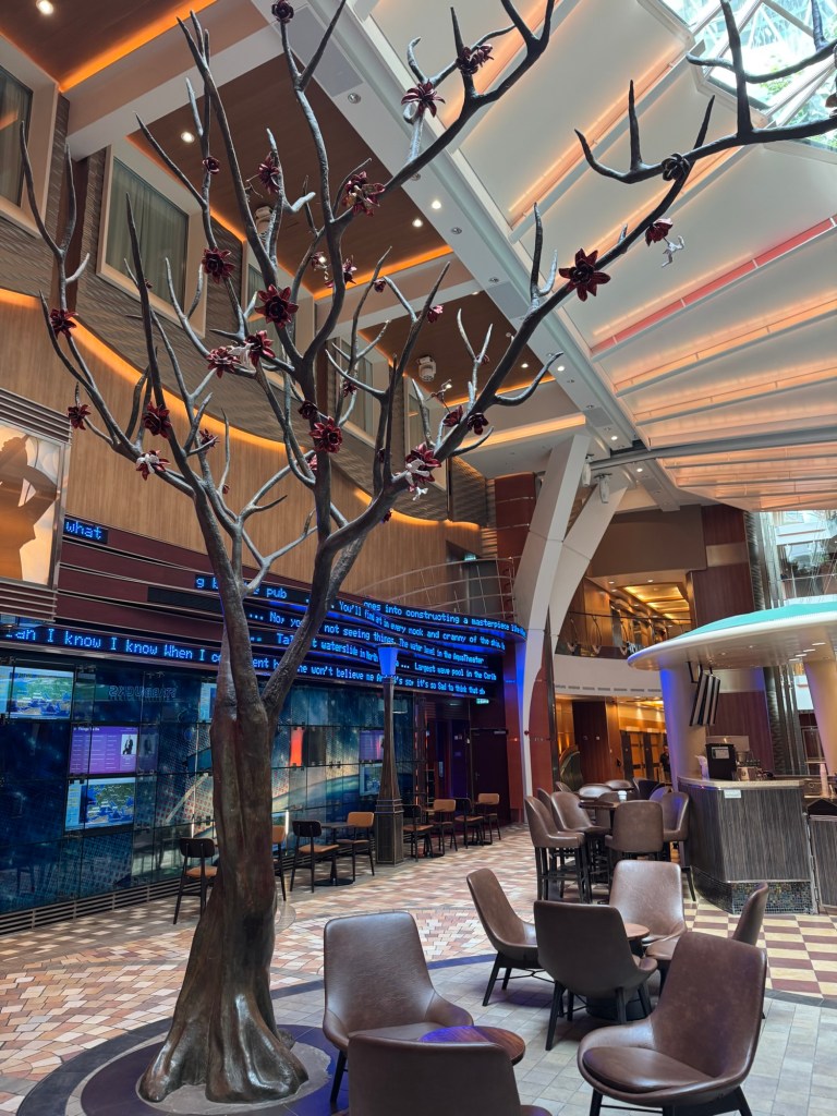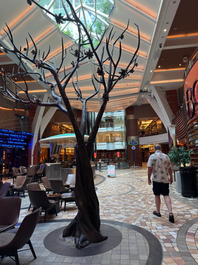 Once we had finished breakfast, we got some fresh air walking along the sun deck. Then we headed back to deck 5. Graham went to Café Promenade to get some coffee. I quickly went back to the cabin to get my soda cup and my iPad. On the way to the cabin, I took some photos along the Royal Promenade as nobody was around. I particularly loved the bronze tree statues. They had Swarovski hummingbirds on the branches. On the way back I filled up my soda cup with fruit punch Fanta and then I caught up with Graham.