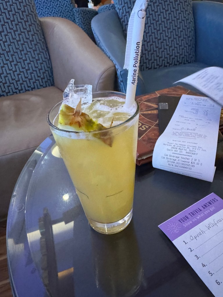 The trivia this time was Who In the World Am I, which was the second time on that cruise that this was offered. About half of the questions were the same as the first time round and the other half was different. We got 20 out of 21, which was the winning score. We were given the choice of some pens or highlighters as a prize. As we already had pens, I went with the highlighters. We had a drink during the trivia. Graham had a glass of Sauvignon Blanc, and I had a Peanut Butter Tropic cocktail which consisted of Skrewball peanut butter whiskey, pineapple juice, bitters, and lemon juice. This has a really strong peanut butter taste is and is absolutely delicious.