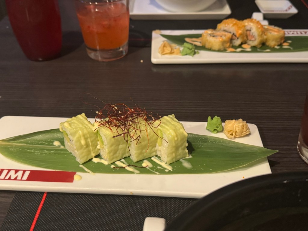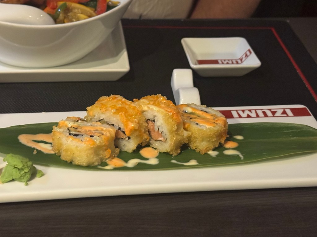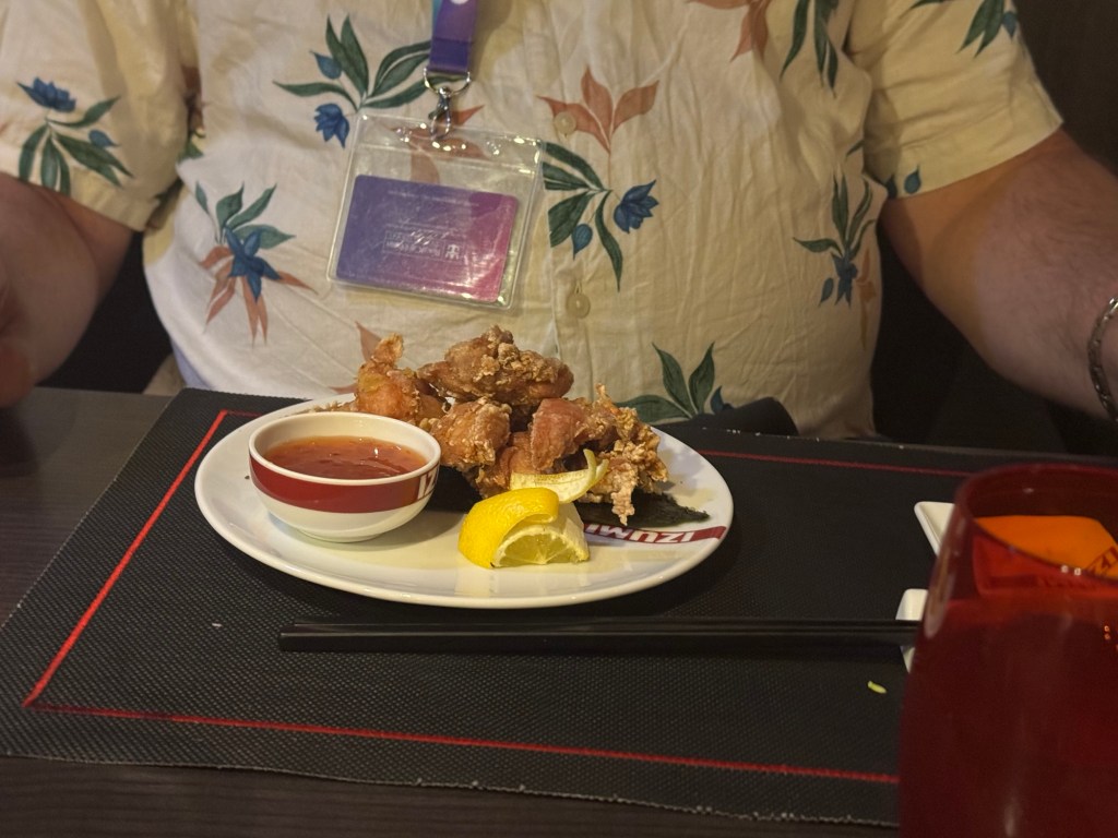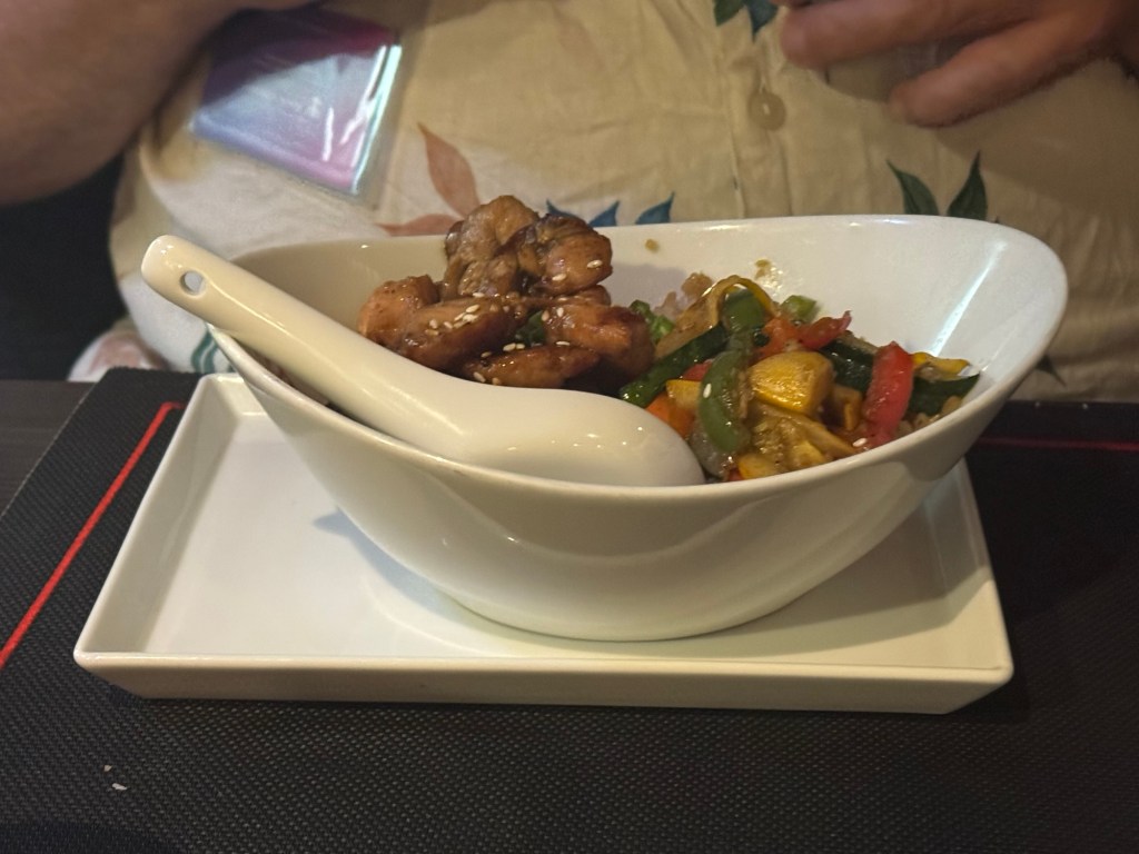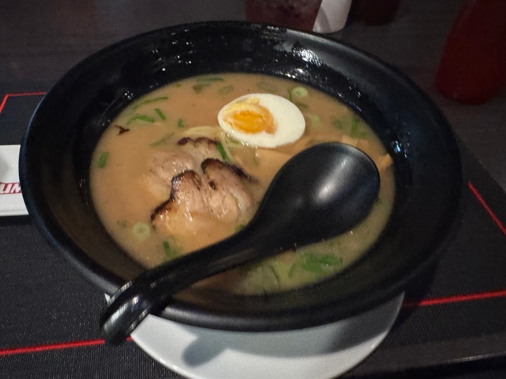 For our large plates, we went with one portion of sushi and one hot dish each. Graham had the Crispy Philly Roll with salmon, avocado & cream cheese flash-fried in panko breadcrumbs, with Champagne sauce, and spicy aioli and the chicken teriyaki with vegetables in a teriyaki sauce with steamed rice. I had the Champagne Lobster Roll, which consisted of blanched lobster, avocado, daikon sprouts, soy wrap, Champagne sauce, and chili thread followed by the Tonkotsu Ramen with egg ramen noodles, tonkotsu pork broth, sliced chashu pork, menma bamboo shoots, and boiled egg. This normally comes with seaweed, but I asked our server to leave this off.