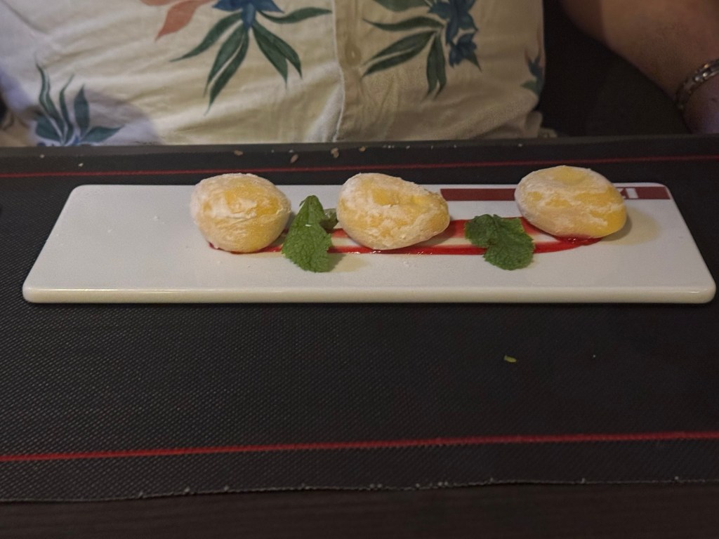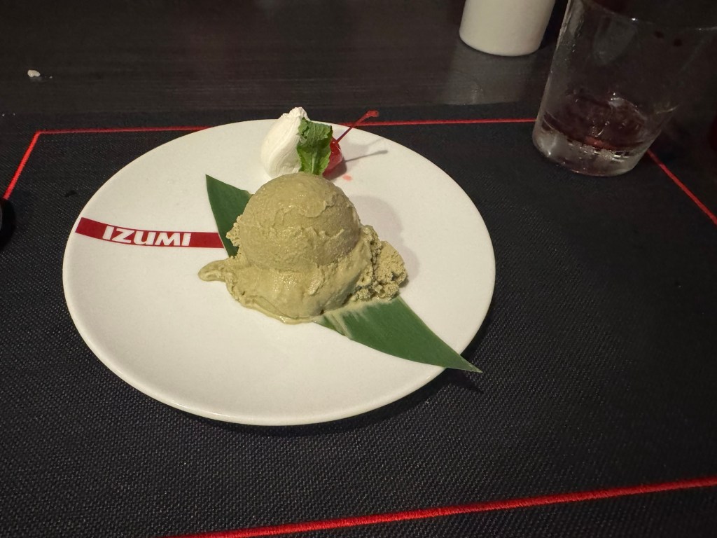 For dessert, Graham had the Mochi ice cream. This normally comes as an assortment of flavours. Graham had specified no chocolate and just ended up with mango Mochi as they only had mango and chocolate that evening. He was good with this. I had the green tea ice cream.