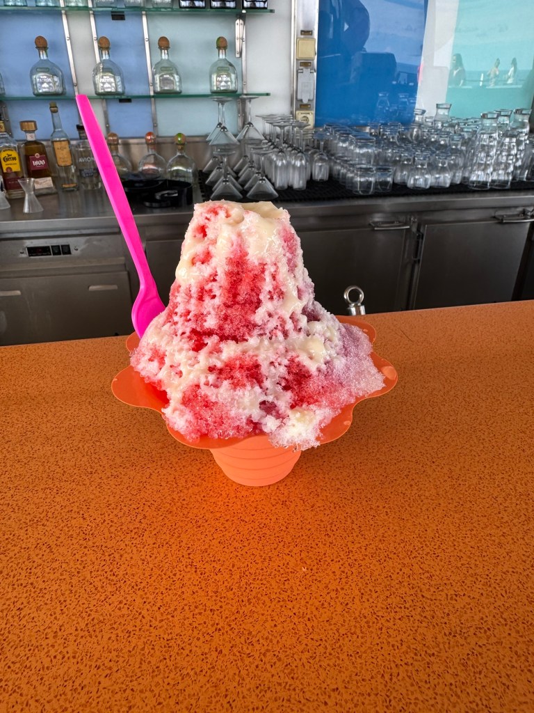 After lunch, we headed up to the pool deck. The reason why I passed on dessert was that I had other plans. They did shave ice at the bar near the flow riders. I had some shave ice with cherry, watermelon and mango syrups and condensed milk. I went to sit on the bleachers by one of the flow riders while I had my shave ice. I do enjoy watching people on the flow rider. As we were leaving, there was a photographer roaming in the area. He offered to take some photos of us. We took him on his offer.