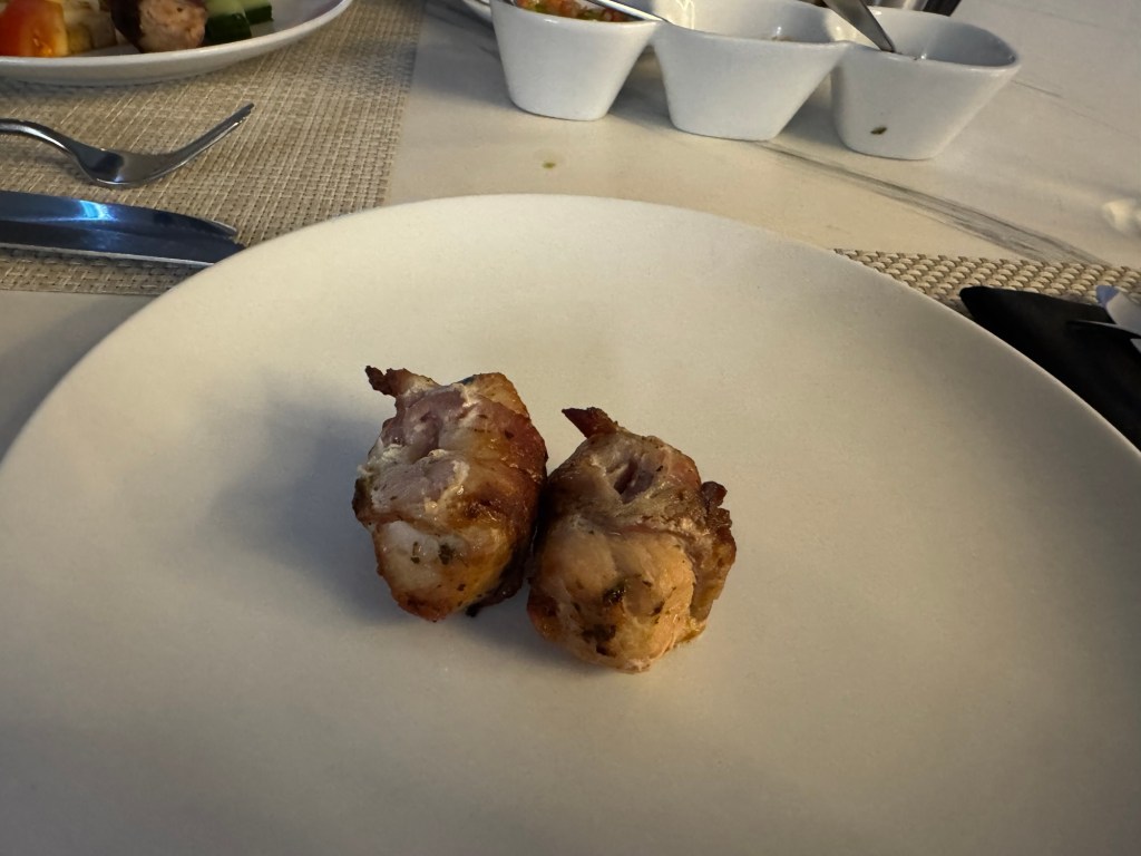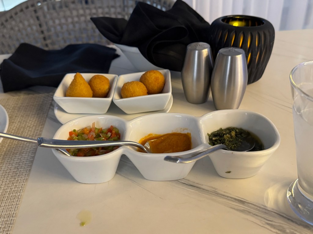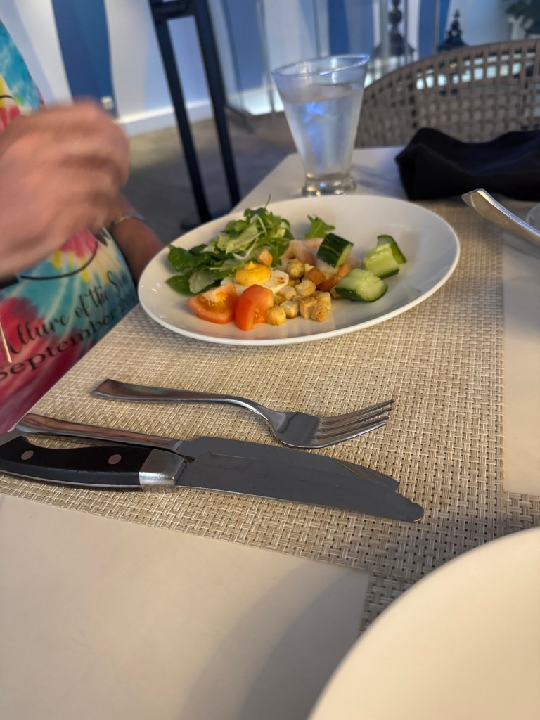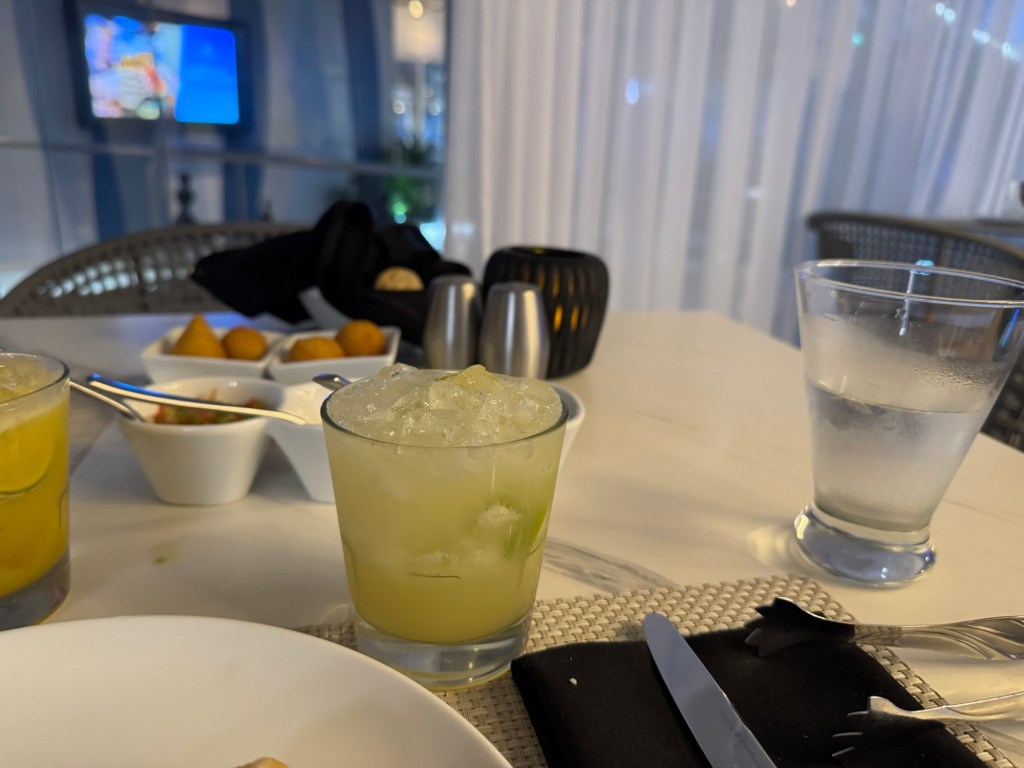We had another reservation for Samba Grill that evening. We got slightly sidetracked. When we came up to the solarium, we saw the beginnings of a sunset developing. The solarium on Allure as an outdoor sundeck in front of the solarium where the bridge wings were on Symphony of the Seas. We figured that this would be a good spot to watch the sunset. It was rather pretty. When the sun had set, we went to check in at Samba Grill. I was hoping that we would have the same serving team, but this did not happen. Still, the servers we had that evening were also very good.