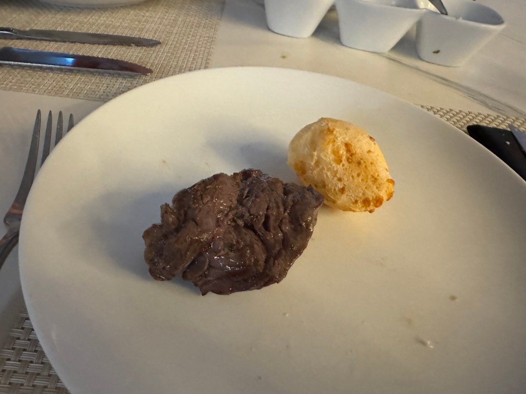 Graham decided to have a caipirinha that evening. He went with the mango flavour that I had on our first visit. I also had a caipirinha, but decided to try the passion fruit flavour. This was even nicer than the mango flavour. Graham had a visit to the salad bar and got a few odds and ends. I decided to be good. As tempting as the black bean stew was, I had two of the croquettes that came out with the drinks and then had the Brazilian cheese bread with the meat. We also were a bit more selective with the meat. We both had the chicken breast wrapped in bacon, top sirloin, and beef tenderloin, which came out in quick succession. Graham had the bottom sirloin, but I was going to pass on this. However, our server convinced me to have at least a tiny bit. Graham also had a lamb chop. I started to wonder if they did not have the parmesan cheese and herb-crusted pork loin that evening. This is one of my favourites and is usually one of the first meats to come out. In the end I did ask, and it was indeed available. Our server brought us some. Graham was raving about the devilled eggs from the salad bar, and I figured I better try one. I did not dislike it, but devilled eggs are not really my thing.