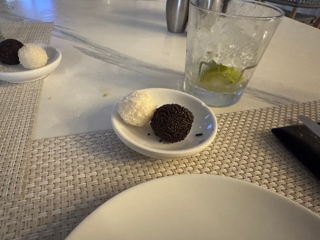 Once the plates for the meats had been cleared away, I had a double helping of the pineapple. We turned down the other desserts, but we did have the little Brazilian truffles. I had both chocolate truffles and Graham had both coconut truffles . Then we said goodbye to our serving team and headed out.