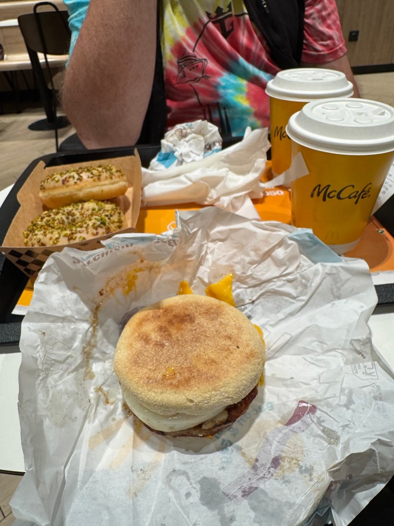 I packed everything up again and then we were free to go. The next order of the day was finding some breakfast. I had a look at the Burger King what was right opposite security, but they had no breakfast menu. There was however a McDonalds round the corner, and they did offer breakfast. We both had a Sausage McMuffin and a pistachio donut. Graham had an Americano, and I had a salted caramel latte. Breakfast hit the spot.