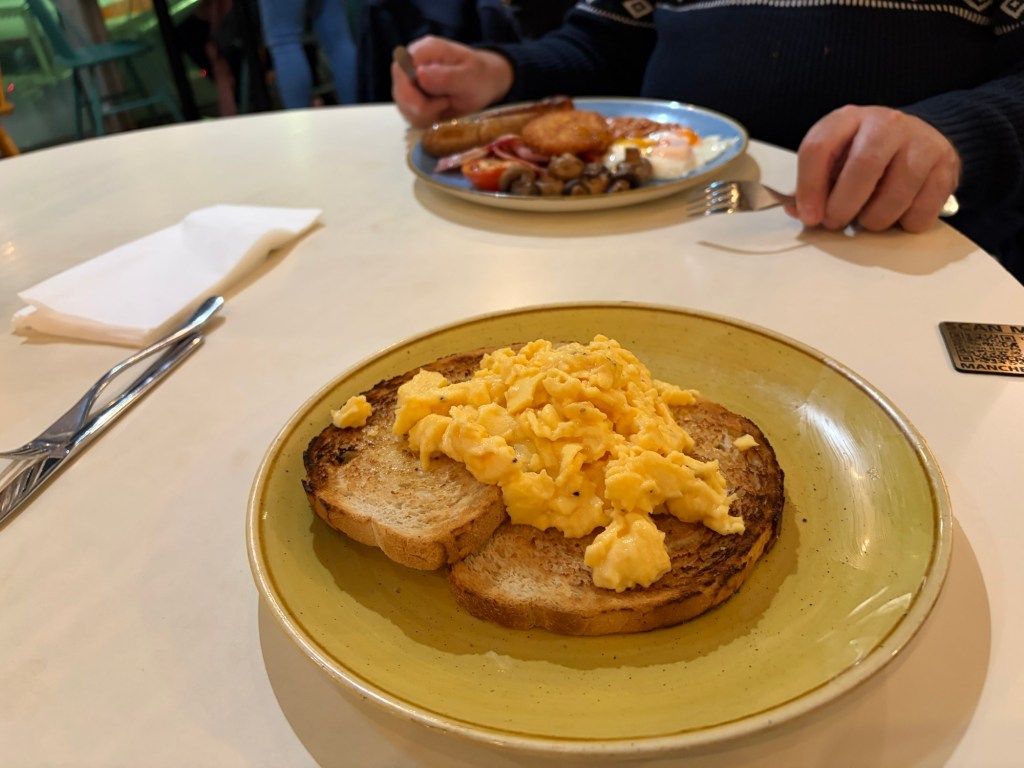 Graham had a full cooked breakfast and some orange juice. I was off my food but knew not eating would make things worse. I had hoped for something like oatmeal or yoghurt and granola, but I was out of luck. I settled on scrambled eggs on sourdough toast. The scrambled eggs were perfect, and I managed one of the two slices of toast. I also had a flat white. Once we had finished our breakfast, we made a quick bathroom stop and then we headed to our gate.