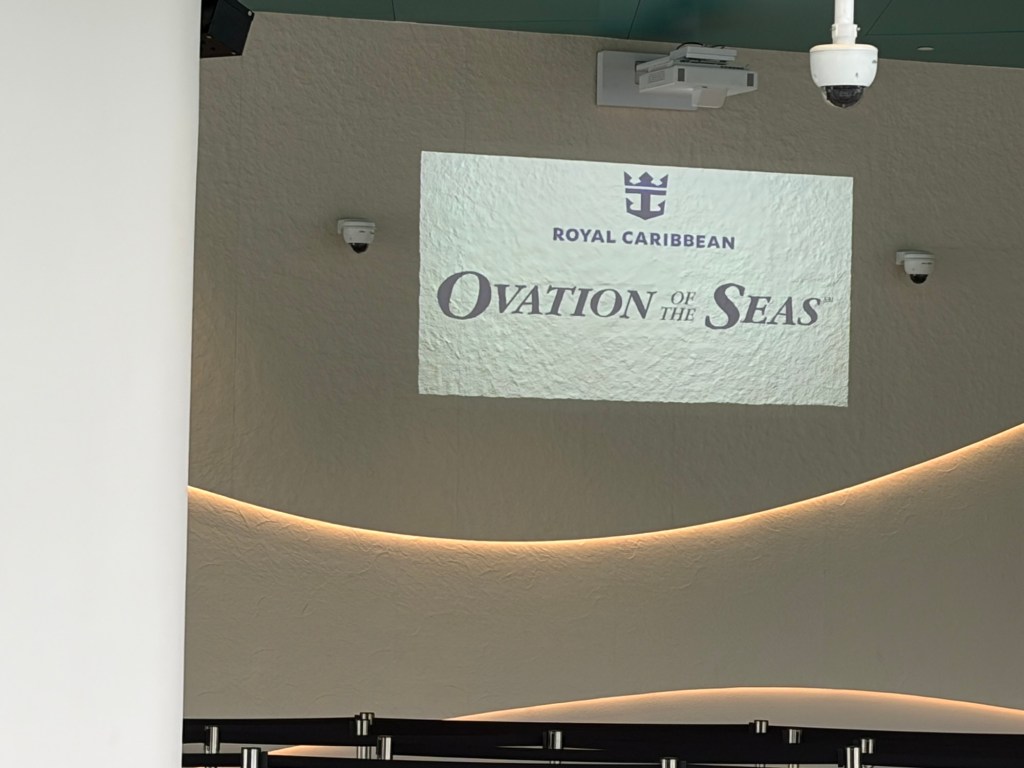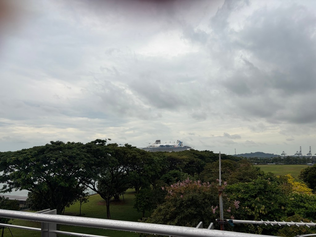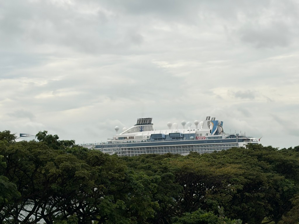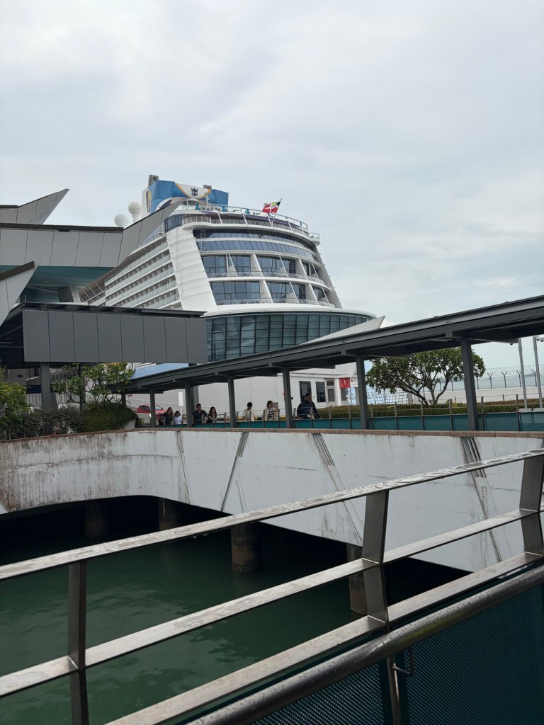 After breakfast, we headed back to the room to get ready. It still looked dreary and wet outside. This did not fill me with joy as we wanted to go to Gardens by the Bay that day. Looking at the weather forecast, it looked like the weather would improve later. There are normally three indoor areas, Cloud Forest, Flower Dome, and Floral Fantasy. I had spotted that morning that Cloud Forest was closed for maintenance that day. This did not make me happy as this this is where the second Chihuly installation in Singapore is located. Still, I figured the other two indoor experiences would keep us occupied if the weather did not cooperate. We set off. When we were getting close to our stop, Graham asked I wanted to head to the Marina Bay Cruise Centre. My favourite ship, Ovation of the Seas, was docked in Singapore that day. There is a covered walkway that goes from just outside the MRT station to just across from the dock. There are also some really nice views along that walk. I took Graham up on this offer. We got off one stop early and changed lines to get to the Marina South Pier MRT station. It turned out to be a wise decision as i was raining pretty heavily when we got there. We headed towards the port, and I managed to get some photos of Ovation.
