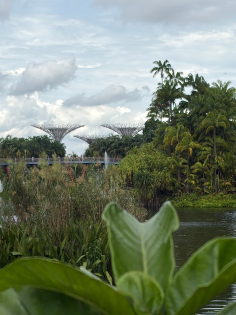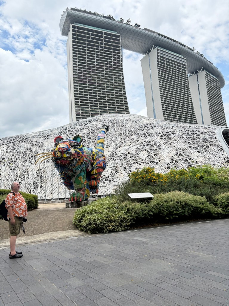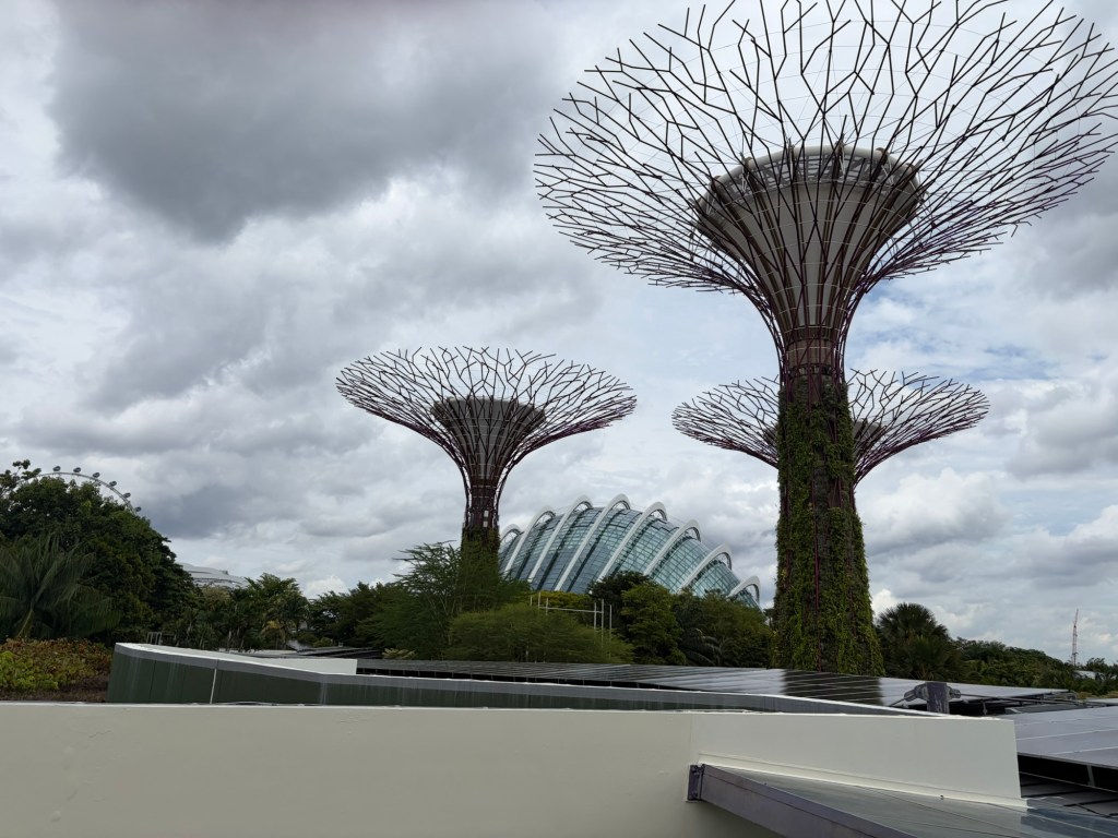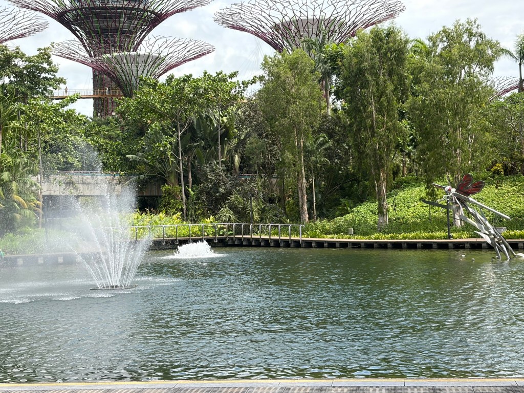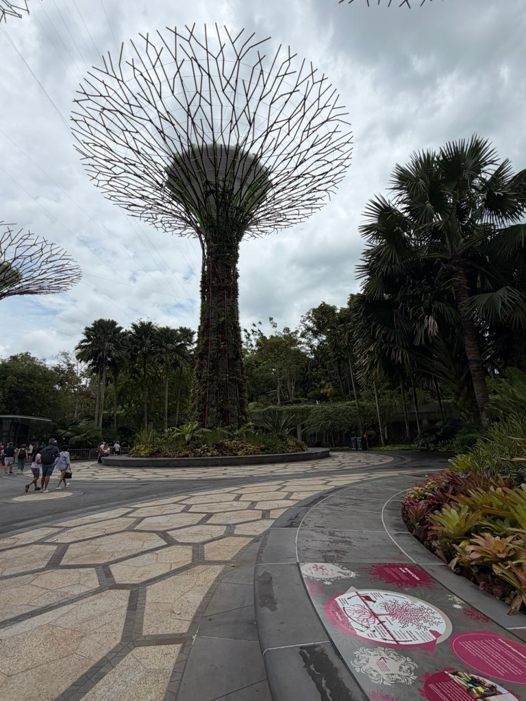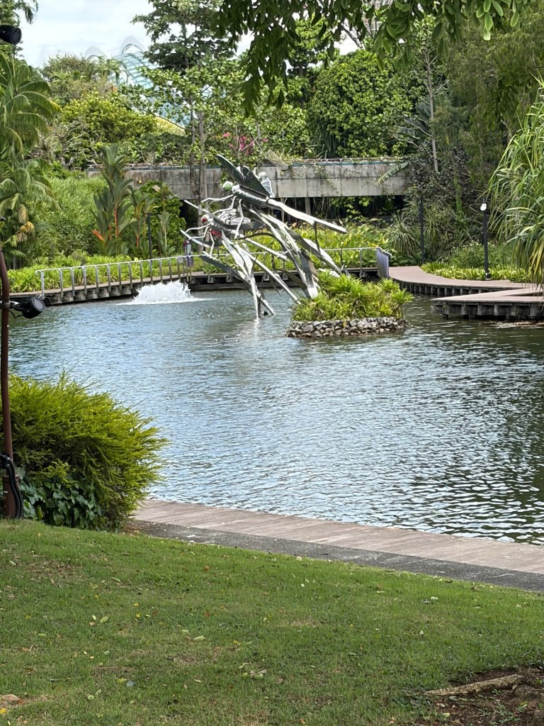 When we looked at the big map before going for a coffee, we spotted that they were offering an audio tour. At 10 Singapore Dollar per person, this did not exactly break the bank. As there was a tour leaving soon, we decided to do this. They used a big golfcart for this. Ironically, everybody on the tour stayed in our hotel. Most of them were going on a cruise the next day. The tour lasted about 20 minutes and took in the main sights including the four Heritage Gardens that represent the heritage of the various cultural groups in Singapore. The four gardens are the Indian Garden, the Chinese Garden, the Malay Garden, and the Colonial Garden. We also went past other landmarks like the Supertree Grove, the Far East Organization Children’s Garden and the Sun Pavilion that concentrates on plants that grow in the dessert. We also passed some of the artwork that is dotted around Gardens by the Bay. Some of this was downright bizarre. At the end of the tour, we stopped outside the Cloud Forest and Flower Dome. People could get off there if they wanted, but we stayed on until we were back at the starting point.