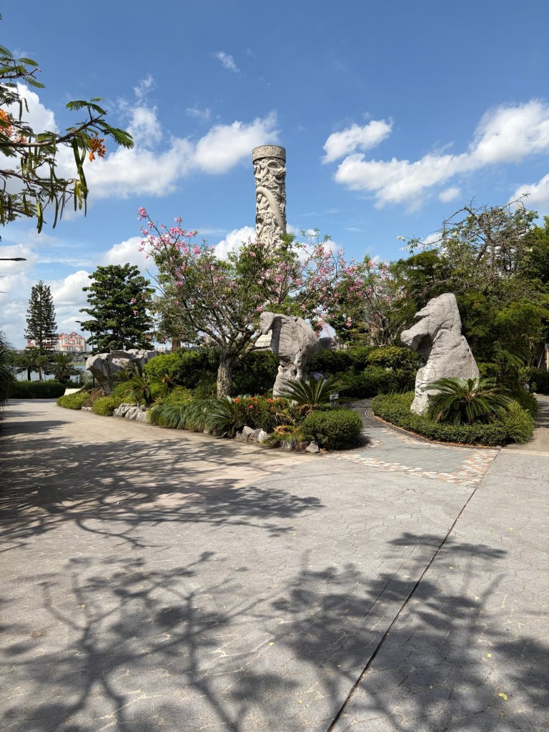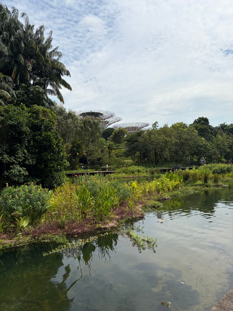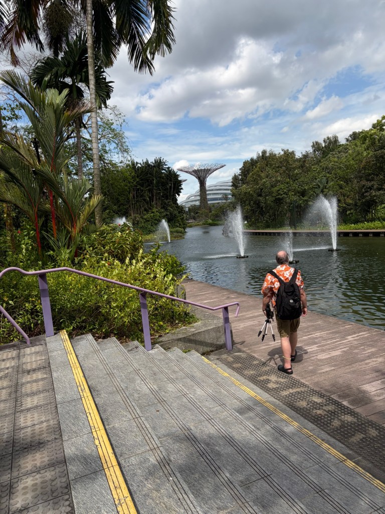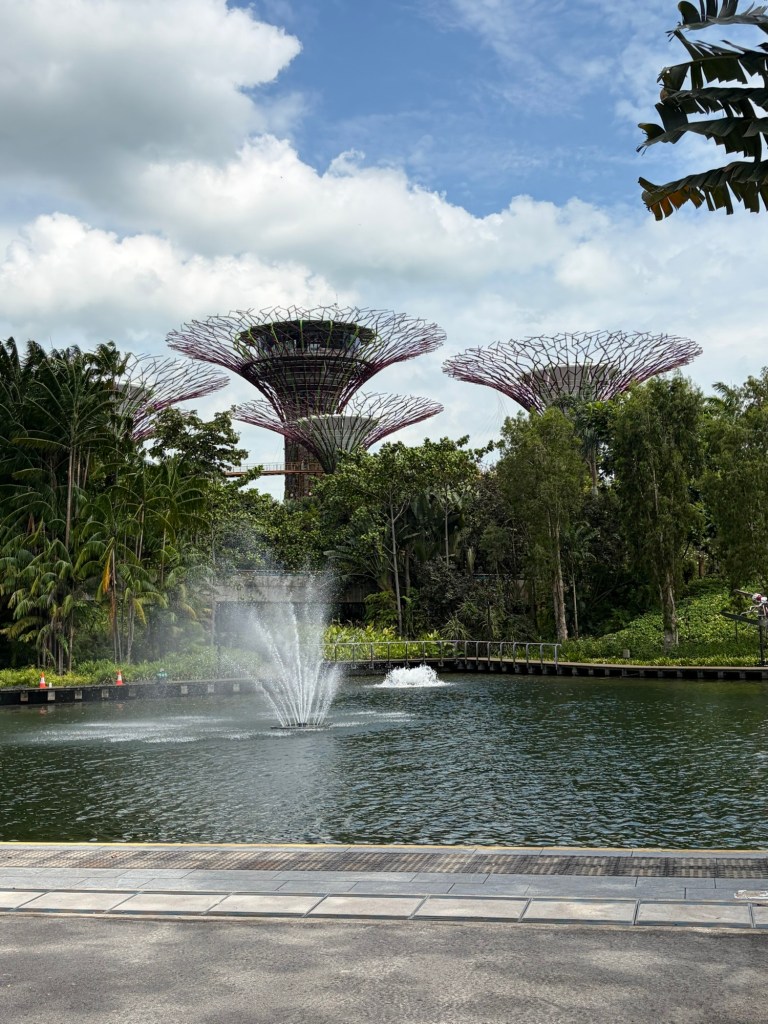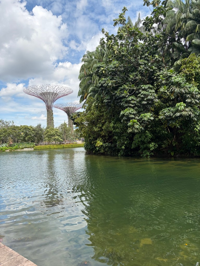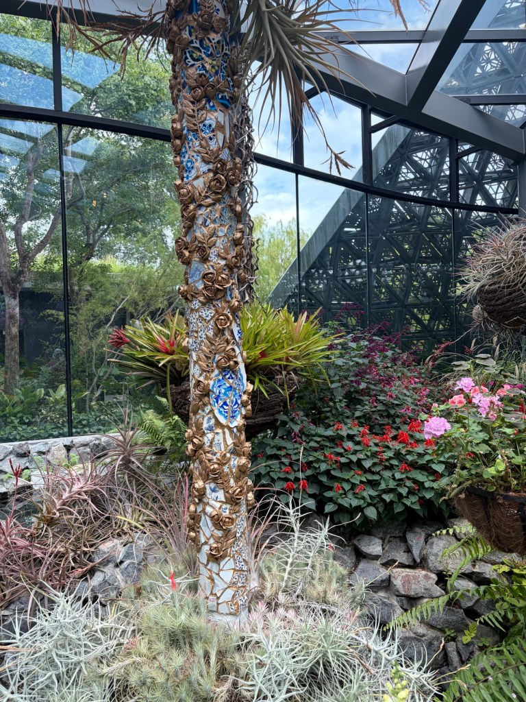 When we looked at the big map before going for a coffee, we spotted that they were offering an audio tour. At 10 Singapore Dollar per person, this did not exactly break the bank. As there was a tour leaving soon, we decided to do this. They used a big golfcart for this. Ironically, everybody on the tour stayed in our hotel. Most of them were going on a cruise the next day. The tour lasted about 20 minutes and took in the main sights including the four Heritage Gardens that represent the heritage of the various cultural groups in Singapore. The four gardens are the Indian Garden, the Chinese Garden, the Malay Garden, and the Colonial Garden. We also went past other landmarks like the Supertree Grove, the Far East Organization Children’s Garden and the Sun Pavilion that concentrates on plants that grow in the dessert. We also passed some of the artwork that is dotted around Gardens by the Bay. Some of this was downright bizarre. At the end of the tour, we stopped outside the Cloud Forest and Flower Dome. People could get off there if they wanted, but we stayed on until we were back at the starting point.