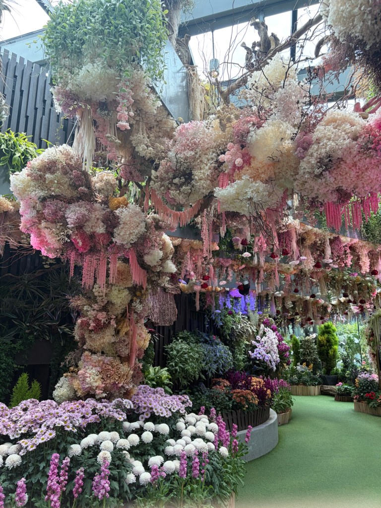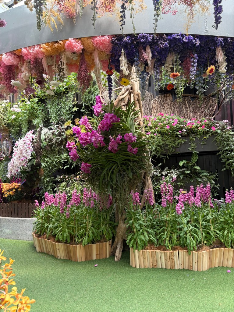 There is an admission charge for Floral Fantasy in the same way that there is an admission charge for Flower Dome and Cloud Forest. However, this is not too expensive. We paid and headed for the entrance. We were given a timed ticket for the 4D ride, Flight of the Dragonfly. My initial reaction was to just sit this out as I am not overly keen on 4D attractions as a rule. Apart from Flight of the Dragonfly, Floral Fantasy is divided into four zones called Dance, Float, Waltz, and Drift. Dance is the first area you get to. This is a riot of colours and seems to defy gravity as a lot of the flowers hang down from the ceiling. There are more than 15,000 cut flowers displayed in Dance at any one time. We took our time to enjoy this. At some stage, I checked my watch, and it was nearly time for our reserved time for Flight of the Dragonfly. I decided that it would give us the chance to sit down and as it was included in our ticket, it made sense to actually use it. Graham was happy to go along with whatever I decided.