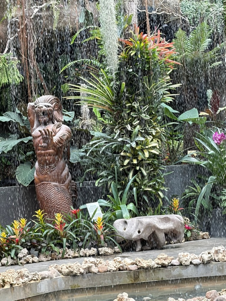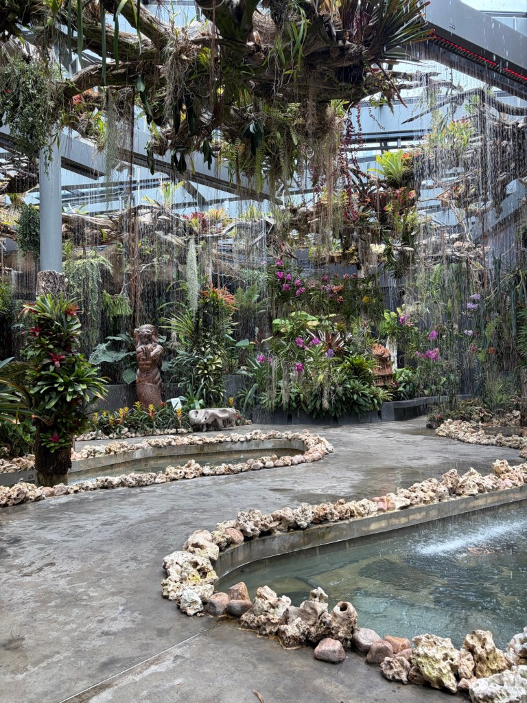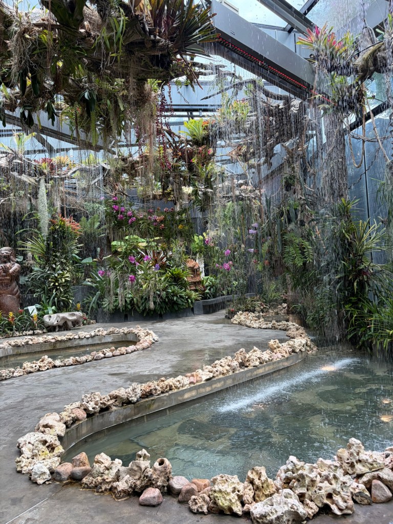 Next up is Waltz where the main feature is water. This area mimics a tropical rainforest. Apart from cascading waters, there is a variety of rocks, driftwood, vines, orchids, and bromeliads. This area has its own Merlion, which unlike its cousin at Merlion Park is a fierce looking creature. At the back of this area is a vivarium with poison dart frogs in all colours of the rainbow.