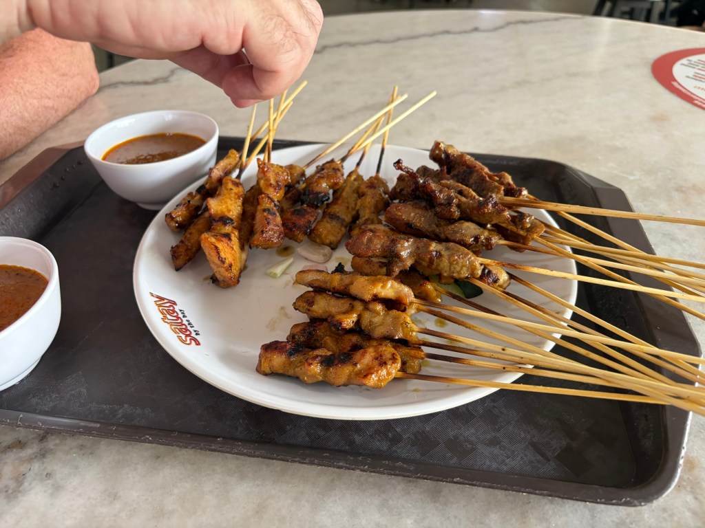 Before we went to Singapore in 2019, I asked a friend who had been to Singapore multiple times for recommendations. One of the recommendations she made was Satay by the Bay. A major attraction is not where I normally would look for good food at affordable prices and the name did sound like a gimmick. I did however trust her implicitly. We decided to give this a go in 2019 and were very positively surprised. There was a great selection of food, everything was tasty, and the prices were great to. Based on this, we decided to go there again. Unfortunately, Satay by the Bay did not seem to have weathered the pandemic well. A lot of stalls were vacant. Stalls have been removed completely from some areas. The stalls that are left are very heavily geared towards seafood, which I don’t eat. There were still some satay stalls, but there are less of them and only one of them was operating when we were there. I got some pork, beef, and chicken satay for us to share. Graham also had some coconut rice with mango. I did not fancy this and passed. We also had some mango juice each. What we did have is nice, but I don’t think I will bother going back this year.