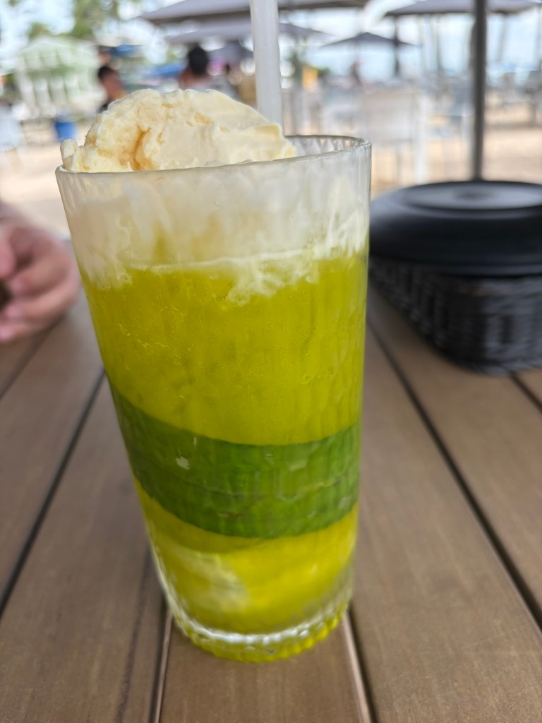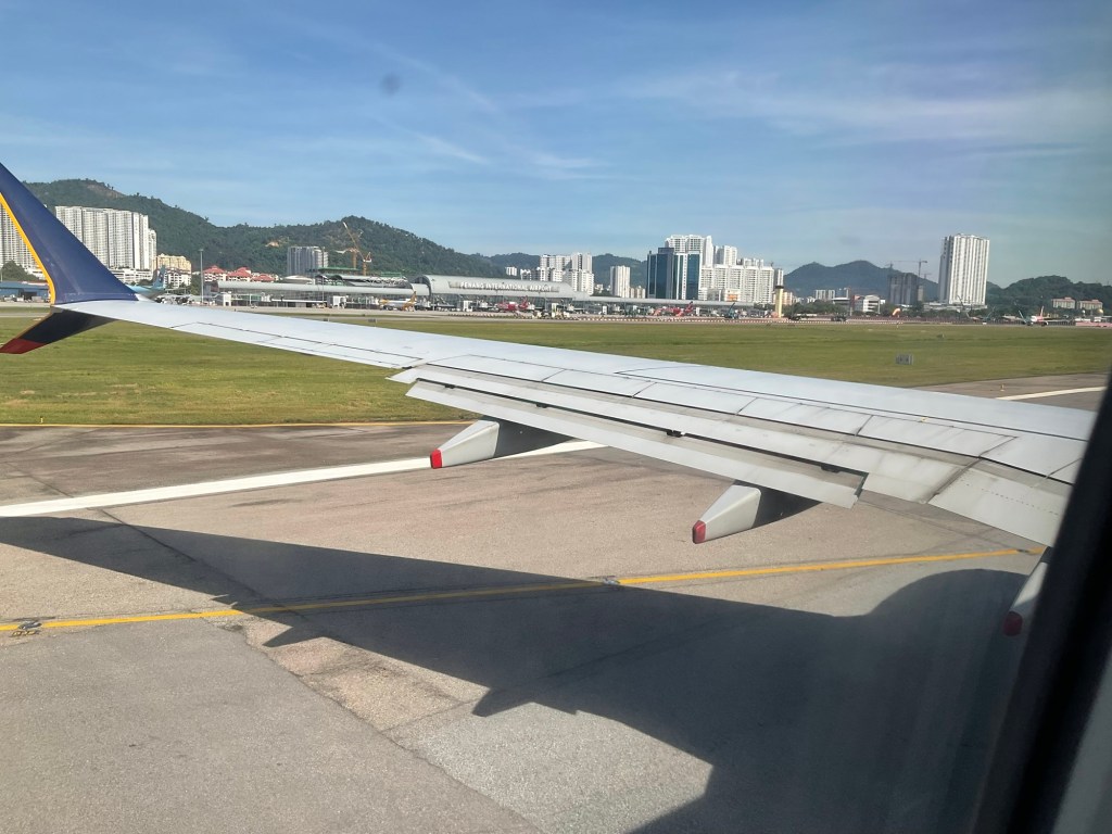 It was time to say goodbye to Penang for this trip. We were up at 06:30, had a shower and finished packing the last odds and ends. Then we headed downstairs and left our luggage at reception. We were outside the restaurant a few minutes before this was due to open. We were the first people to be seated. Breakfast was far from a leisure affair that day. We both had some coffee and pink guava juice. Graham had fruit, yoghurt, pastries, and fried egg on toast. I got some chicken congee, the crispy crepes that I had enjoyed so much during our stay, some tinned longans as well as a slice of pandan cake and some kaya toast. They also had the peanut butter ice cream that day. I had a scoop of that for good measure.
