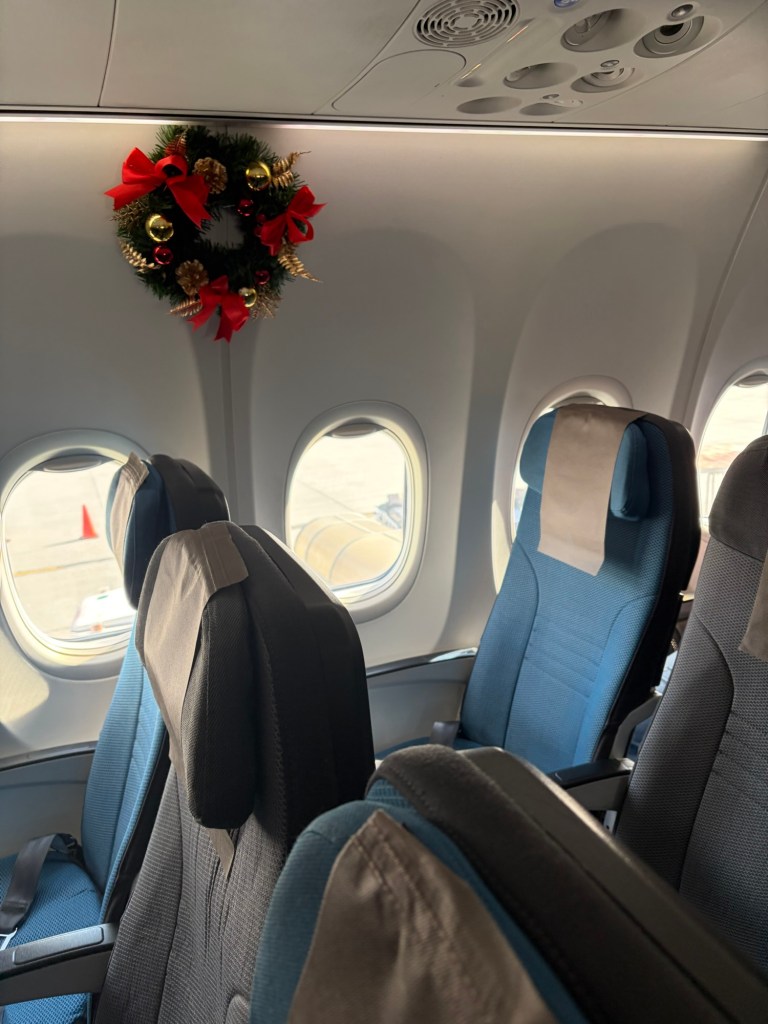 I could not believe my eyes when I boarded the plane. Above every third or fourth window, there was a Christmas wreath. I had never encountered a plane that was decorated for Christmas before. I took a quick photo and then we settled into our seats. We had another smooth flight. We were offered another pizza slice. Graham had his, but I passed. I did have some mango juice though. I started reading, but we had a beautiful clear day and for the majority of the flight, I looked out of the window. I know it is hard to judge an airline by a short haul flight, but we were pretty impressed with Singapore Airlines based on the two short flights we had experienced with them. I hope they will be just as impressive when we fly all the way from Manchester to Singapore with them later this year.
