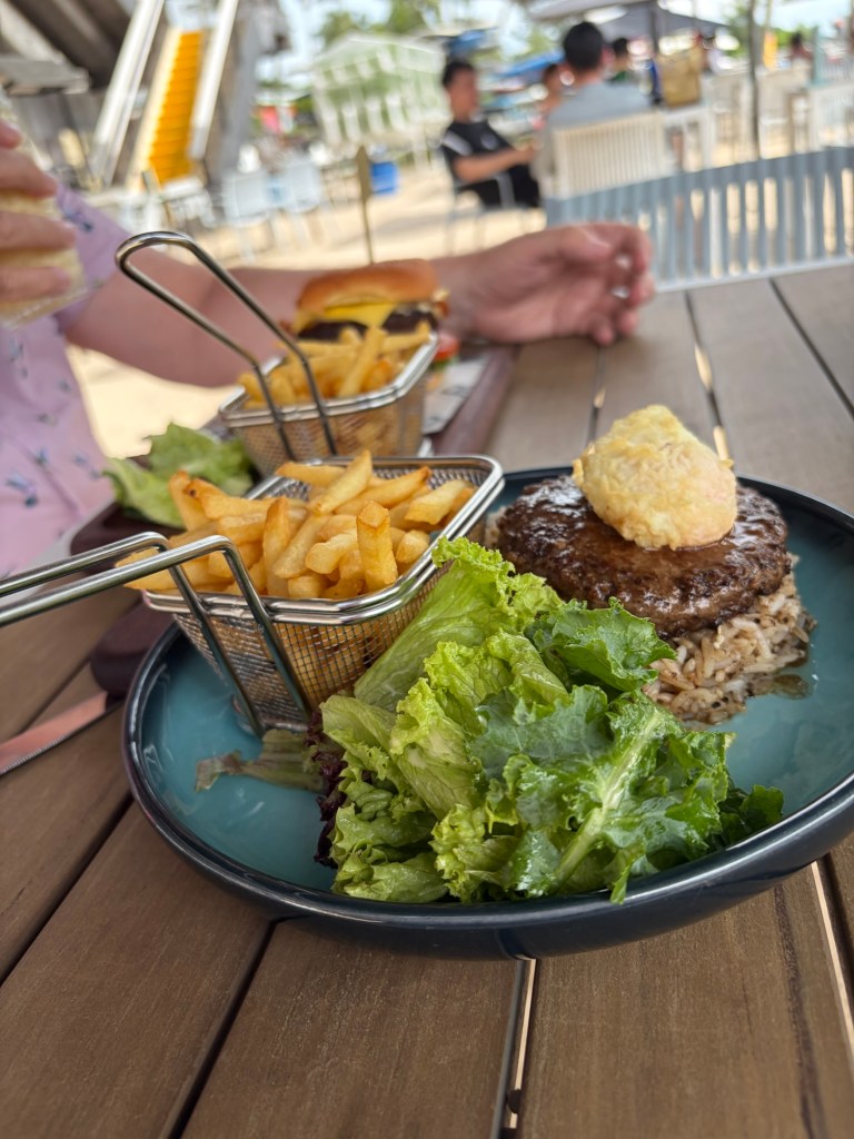 As soon as we were seated, we were given a menu, but then it took a little while for somebody to take our order. Graham had a Mango Tango smoothie, which consisted of mango, passion fruit, and yoghurt. I had a Pan Pan Melo mocktail, which consisted of mango, honeydew melon, pandan, and vanilla ice cream. We both agreed that I had made the better choice as my drink was something special. Graham had been graving a burger and had the Cheesy Beef Burger with Bacon, which consisted of beef patty, cheese, bacon, egg, gherkin, tomato, lettuce, mustard mayo, brioche bun, fries, and salad. I was very happy when I spotted loco moco on the menu, which is something I developed a taste for on Oahu. Their version consisted of a Wagyu patty, Kombu rice, tempura egg, fries, and salad. This was delicious and hit the spot. Graham liked his burger, too.