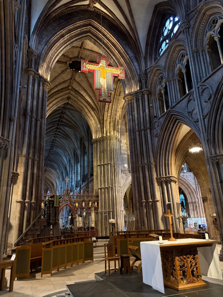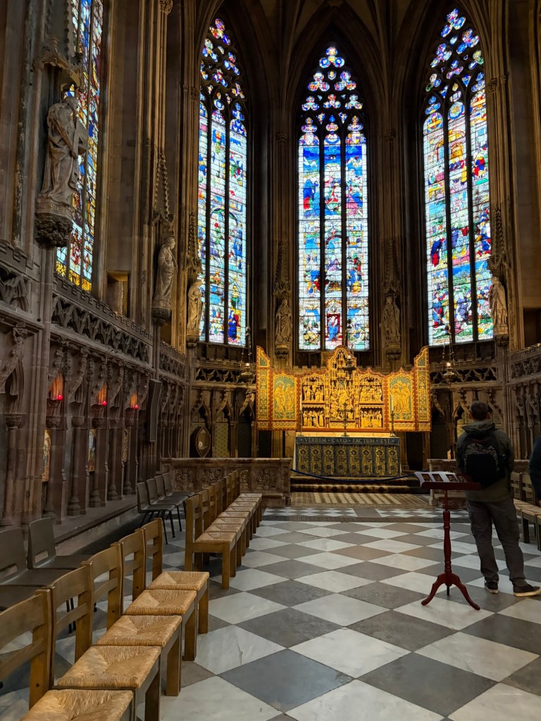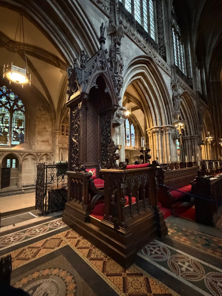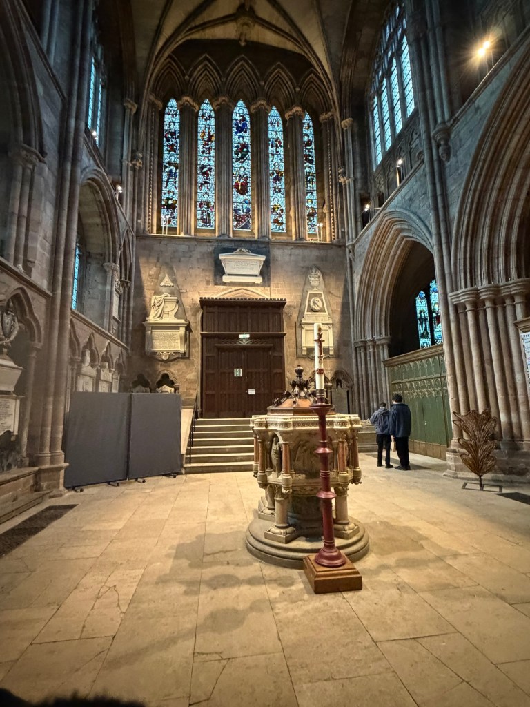 We were also incredibly lucky that we were able to see some much more temporary treasures. While we were here, a visiting artist specialising in iconography was there working on her art and a number of her works were displayed around the chapter house an in one of the transepts. This was a real trat. However, it could not quite match up to the second temporary treasure. A Table for the Nation is a 13-metre-long table made from a section of 5,000-year-old black oak. The oak had been submerged in a peat bog and was discovered in 2012 on a far in south-west Norfolk while the farmer was cultivating the land. As it was discovered in the year of Queen Elizabeth II’s Diamond Jubilee, it is now known as the ‘Jubilee Oak’. Crafts people managed to dry and preserve the wood. A plank from the tree was then turned into the table. It was initially on display at Ely Cathedral and then moved to Lichfield cathedral for one year. It has now moved on to its next destination. Our guide explained that this table had been very much enjoyed during its stay in Lichfield and then that there had been regular dinners where people sat around the table. The people of Lichfield also created a table runner for the table which is made up of hundreds of individually decorated textile squares. The finished table runner was unveiled on 26th March. I would have loved to see this. We thoroughly enjoyed the tour and also our own explorations of the cathedral. If the weather had been nice, I don’t think we would have made time for the tour, and this would have been a real shame.