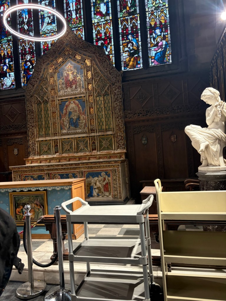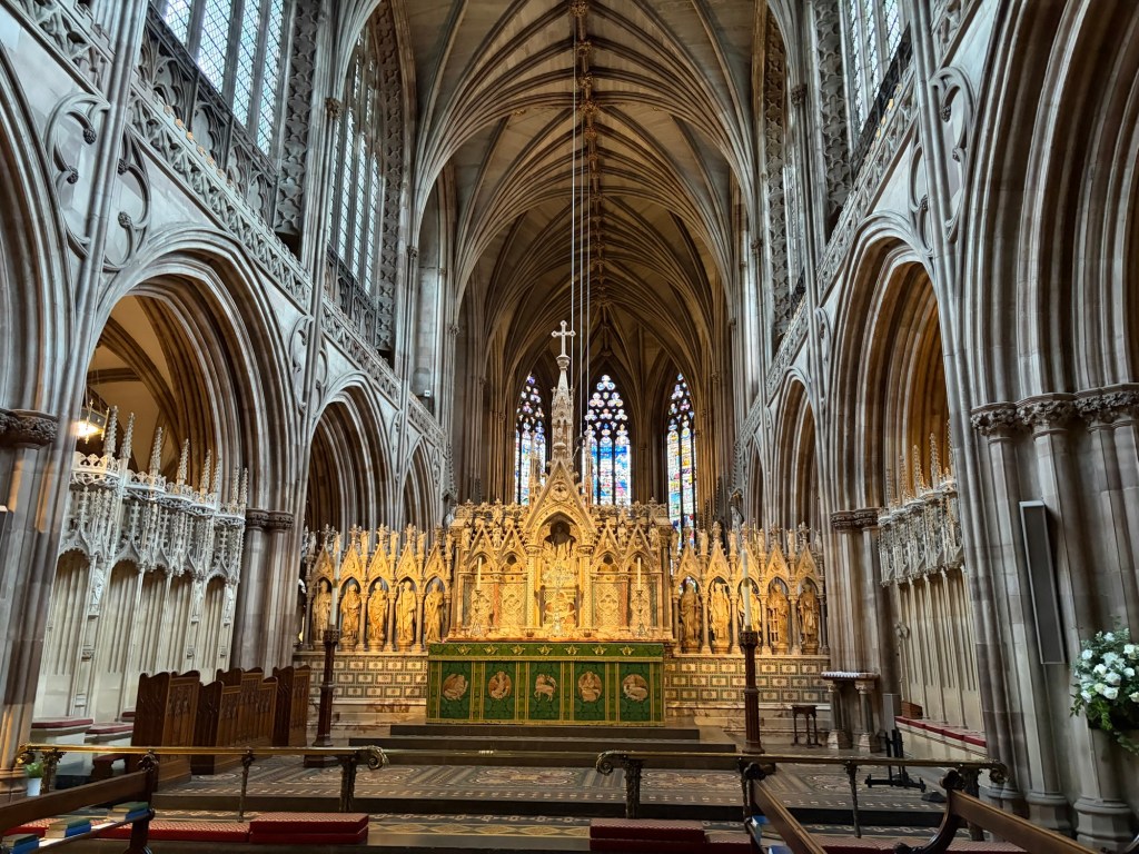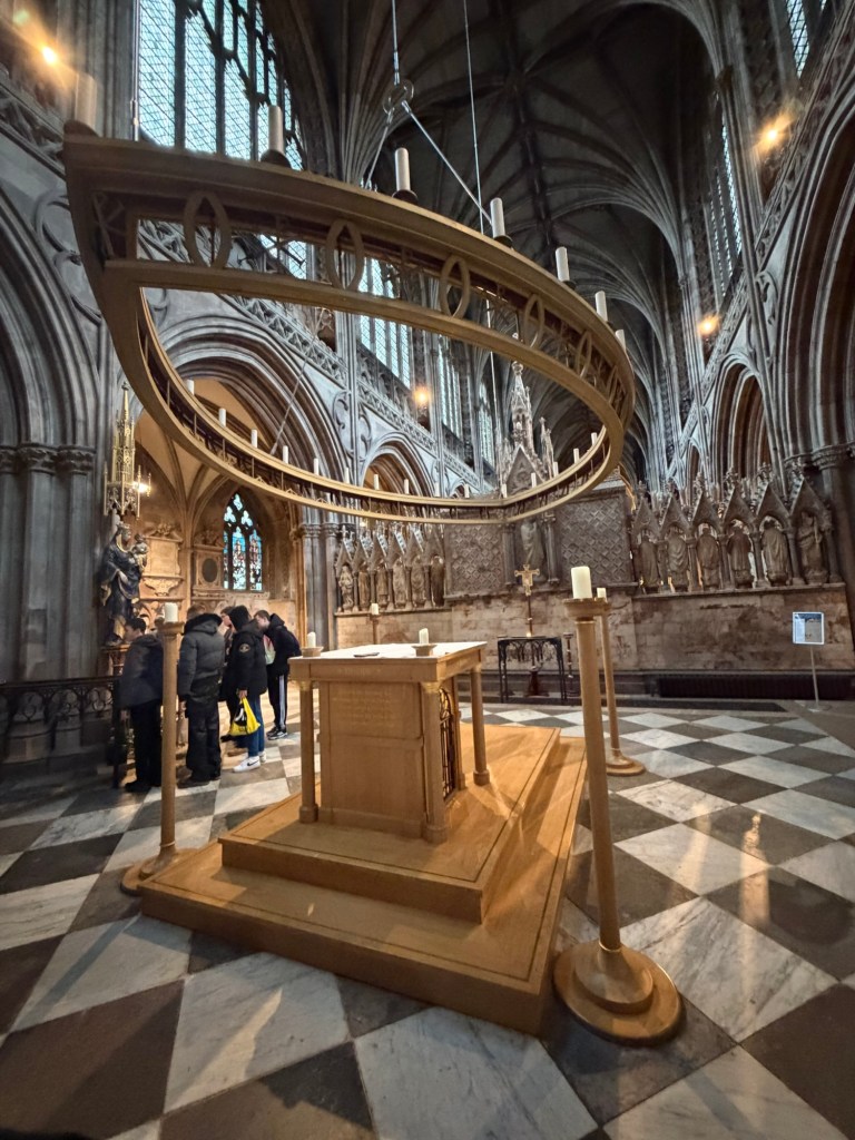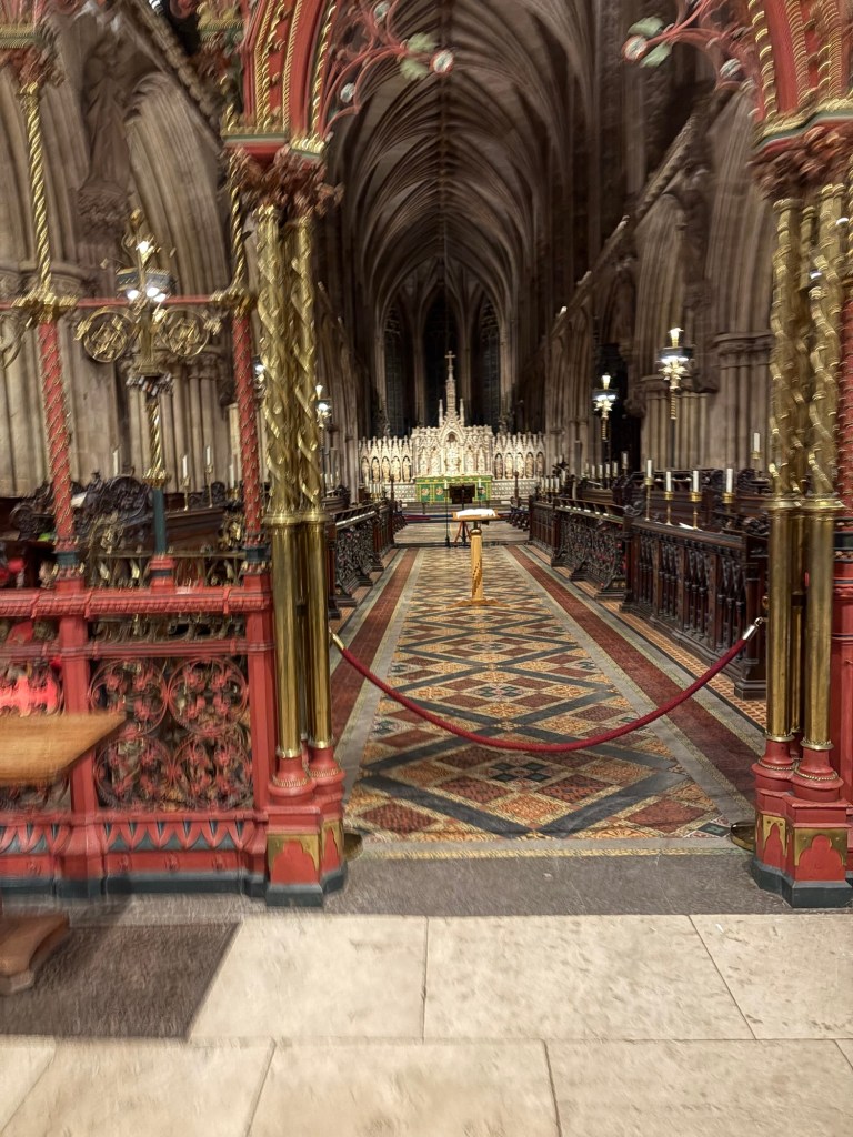 We were also incredibly lucky that we were able to see some much more temporary treasures. While we were here, a visiting artist specialising in iconography was there working on her art and a number of her works were displayed around the chapter house an in one of the transepts. This was a real trat. However, it could not quite match up to the second temporary treasure. A Table for the Nation is a 13-metre-long table made from a section of 5,000-year-old black oak. The oak had been submerged in a peat bog and was discovered in 2012 on a far in south-west Norfolk while the farmer was cultivating the land. As it was discovered in the year of Queen Elizabeth II’s Diamond Jubilee, it is now known as the ‘Jubilee Oak’. Crafts people managed to dry and preserve the wood. A plank from the tree was then turned into the table. It was initially on display at Ely Cathedral and then moved to Lichfield cathedral for one year. It has now moved on to its next destination. Our guide explained that this table had been very much enjoyed during its stay in Lichfield and then that there had been regular dinners where people sat around the table. The people of Lichfield also created a table runner for the table which is made up of hundreds of individually decorated textile squares. The finished table runner was unveiled on 26th March. I would have loved to see this. We thoroughly enjoyed the tour and also our own explorations of the cathedral. If the weather had been nice, I don’t think we would have made time for the tour, and this would have been a real shame.