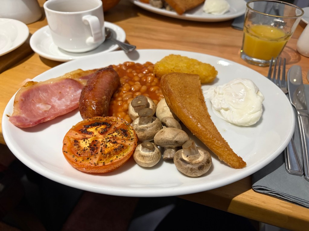 When I looked out of the window in the morning , this did not fill me with joy. It was raining heavily. The weather forecast had looked promising, but unfortunately this had turned on us. Still, there was nothing that we could do about it. We got up and ready for the day. Then we headed downstairs for breakfast. The hotel was definitely Collaborator central that morning. Collaborators are what the band calls their fans. I think probably everybody apart from Graham who was at breakfast that day had been to the concert the evening before. Breakfast was very nice. Graham had some fruit and yoghurt to start and I had some muesli. We then both had the full English breakfast with poached eggs. We also both had coffee and orange juice. Breakfast hit the spot.