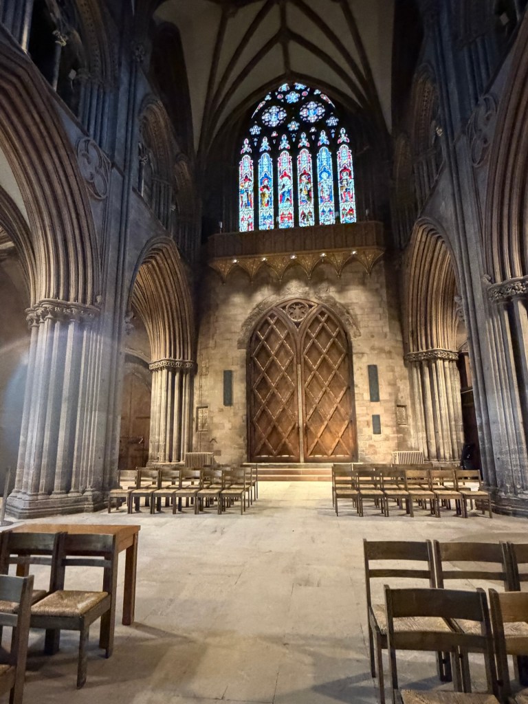 After breakfast, we went back up to the room. I figured we would stay there as long as we could, but Graham was keen to get going. I packed my stuff and then we went downstairs to check out. I quickly took a photo of the hotel and then we headed towards the cathedral. It was still raining pretty heavily, but thankfully the cathedral was not far from the hotel. I was surprised that all the chairs were pointing in the opposite direction from the evening before. This must have taken forever. The person at the information desk offered us a guided tour for a small fee which was due to leave an hour later. As our original plans would not have worked in this weather, we decided to go for it. We used the time until the tour started to explore on our own.