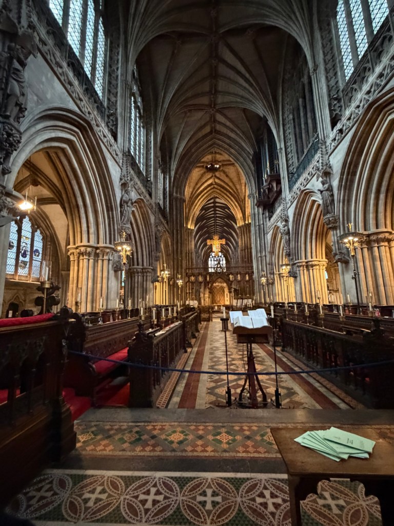Graham had told me that the cathedral was stunning and he was not wrong. There were stewards near the main entrance hat intercepted people and sent everybody to a side entrance. There were more stewards there to check tickets and to point people in the right direction. At Lichfield Cathedral, they had numbered seats. I was quite near the front. As I was going to two concerts, I had bought the cheapest tickets. At Lichfield Cathedral, this was a restricted view. Mt seat was off the side and a massive pillar obstructed most of the view of the stage. I was absolutely fine with this as I had come for the music.